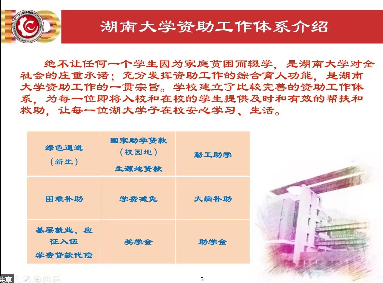 在第二部分的学生资助工作培训中,李迪老师介绍了湖南大学资助工作体系中的九类学生资助——绿色通道、生源地贷款、校园地贷款、勤工助学等。其次,李老师就两种助学贷款指出:我们更推荐大家申请生源地贷款,因为校园地贷款的时间在开学之后,学生在申请时可能会出现遗漏一些流程的事情。同时李老师提出相关人员在进行学生资助工作时应积极维护学生隐私,做好相关的工作。