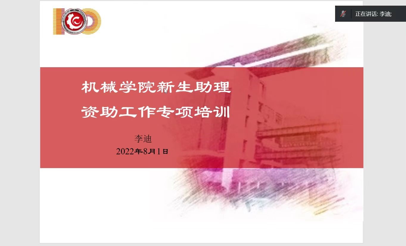 2022年7月31日下午3:00,机械与运载工程学院于腾讯会议开展了新生助理培训。本次培训由新生助理总负责杨少晨同学主持,并由李迪老师就高校新闻宣传及资助工作两个方面开展培训。机械院王玉迪老师及全部新生助理共同参加了此次会议。