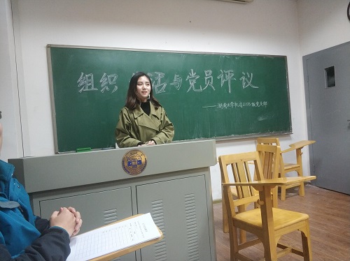 接下来就是支部同志们对自己过去一年的总结和对未来的展望。纪检委员任旭濛作了如下总结:“17年十二月开始担任支委,积极协助老师抓好思想作风建设,学习成绩连续班级第一,积极参加比赛与志愿活动,取得物理竞赛二等奖、力学竞赛三等奖的荣誉,最后就是自己努力,短板英语六级480分通过。不足之处是软件应用方面。‘不忘初心,牢记使命’自己将以这次专题组织生活会为新的起点,倍加珍惜,倍加努力。”