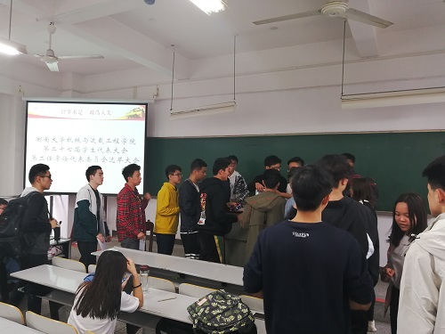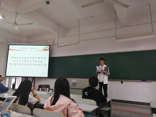 2019年4月16日12:40,我院第二十七届学生代表大会第二任代表委员会选举大会在综合楼212隆重举行。我院48位学生代表出席了此次选举大会,湖南大学校学生会学生事务办公室干事李泽睿等出席此次选举大会并监督大会的选举过程。此次选举大会由我院学生会主席高传昊主持。