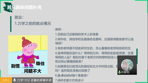 17级的同学们正处于大学阶段一个非常关键的时期,但由于疫情,同学们基本没有机会与老师见面交流,为了更好的帮助同学们更加理性的进行生涯规划,促进老师与同学们的沟通,4月20日晚上7点,机械与运载工程学院本科17级力学系围绕“力学专业本科生发展:研究生、工作或出国”为主题,召开了一次线上主题班会,使同学们对于未来的发展有了更清晰的认识和规划。力学系主任方棋洪老师、支部书记任毅如老师、院长助理周加喜老师、副主任韦凯老师、张海成老师、冯慧老师以及17级力学全体学生参加了本次班会。