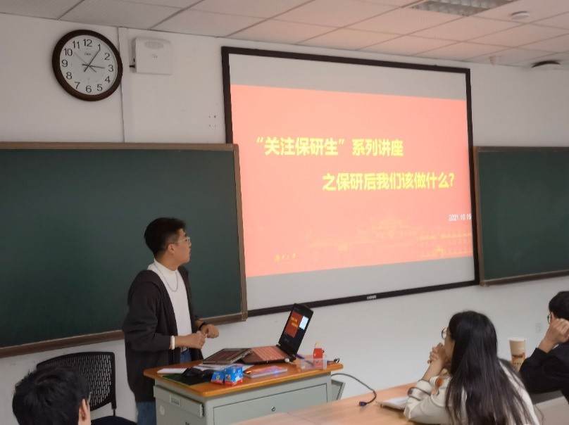 10月19日下午15:00,“‘关注保研生’系列讲座之保研后我们该做什么?”活动于研究生楼A112教室举行。讲座主要内容为研究生学长学姐们针对各位保研生的大四规划以及未来研究生阶段的问题进行解疑答惑,分享经验。