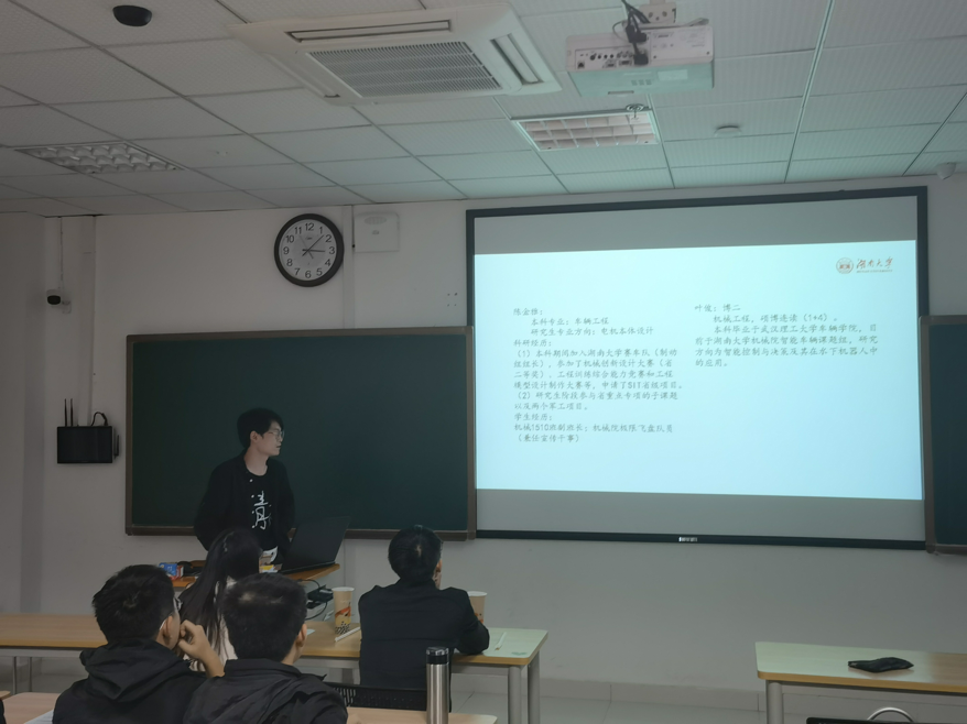 活动首先进行的是学长学姐的个人介绍。与会分享人员有:陈金雅学长(研究方向:电机本体设计)、叶俊学长(研究方向:智能控制与决策及其在水下机器人中的应用)、陈天玮学姐(研究方向:基于微纳制造的电催化)和赵庆坤学长。四位学长学姐成绩优异,能力出众,在本科乃至研究生期间都积极参加各种竞赛与科研工作,经验丰富。