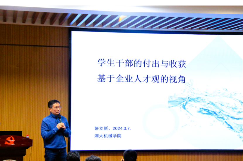 3月7日晚,机械与运载工程学院“校友回湘论坛”暨2024年度学生干部培训班第五场讲座于401报告厅举行,此次讲座邀请了湖南大学优秀校友、康明斯原副总裁彭立新教授为学生干部们带来了一场主题为《学生干部的付出与收获﹣基于企业人才观视角》的授课。学院党委副书记刘明然、各年级辅导员出席,学院180余名学生干部参与。