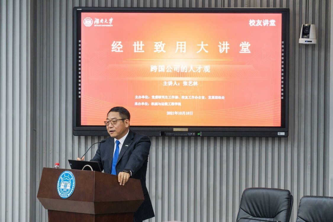 张艺林校友首先从一张黑白毕业照片引入,深情怀念自己在湖南大学度过的美好学生时代。随后结合自己在舍弗勒集团的工作实践,从价值观、适应能力、团队精神、知识结构、终身学习、国际视野六个方面阐述了新时代的人才观,鼓励同学们做快速学习者、高效执行者和敏捷创新者,将个人发展与国家建设相结合,争做经世致用的领军人才。