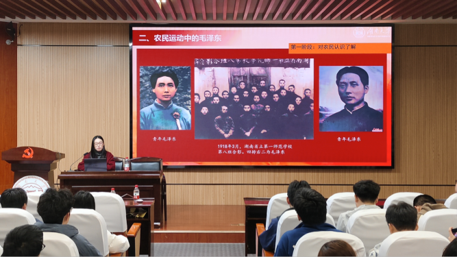 首场党课由湖南大学博士理论宣讲团的张嘉怡、彭祎两位主讲。张嘉怡以"党和人民的骆驼——任弼时"为主题,深入阐释了骆驼精神的深刻内涵及其时代意义。彭祎则以"农民运动中的毛泽东"为题,结合《湖南农民运动考察报告》,带领学员领会"实事求是"的建党精神。