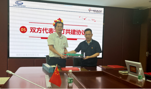 机械与运载工程学院副院长戴宏亮与云箭集团研究院副院长、党委书记陈军互赠共建礼物。双方代表力学系党支部书记任毅如、湖南云箭集团有限公司研究院第二党支部书记陈明签署了共建协议。