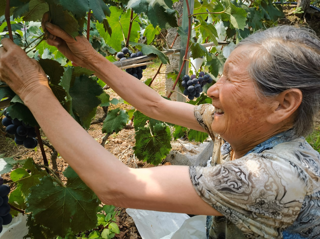 调研团队首先采访到的是唐秀清奶奶。唐奶奶说自己种葡萄已有30多年,是村里最早参与葡萄种植的村民之一。唐奶奶主要种植巨峰葡萄,她为调研团队耐心讲解了种植巨峰葡萄的注意事项。唐奶奶觉得认真种好一种葡萄足矣。唐奶奶的葡萄主要由她和老伴儿两人管理,儿女负责种植、采摘与销售。葡萄成熟之时唐奶奶一家人聚在一起摘着自家亲手种的葡萄,尝着自家种的葡萄,空气里弥漫着幸福的味道。说到这里,唐奶奶满脸都洋溢着幸福的笑容。