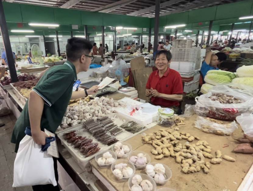 2023年7月30号上午,湖南大学赴浙江绍兴“新说吴语”推普团队前往小镇繁华的江藻农贸市场,在人流密集和交流频繁的市场近距离调研商贩和当地居民的普通话使用情况和水平。