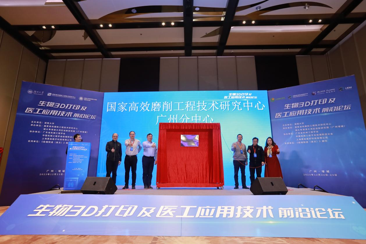 活动现场,国家高效磨削工程技术研究中心广州分中心以及湖南大学-上海黑焰医疗科技有限公司生物3D打印联合研发中心揭牌,各方将进一步在产学研合作上做出有益探索,提高科技成果转化和产业化水平,共同推进先进制造与生物制造产业的发展与进步。