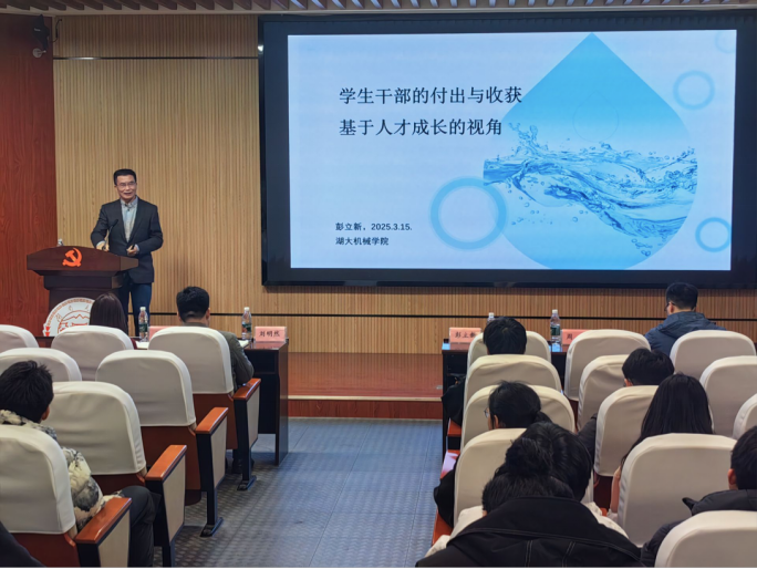 3月15日,机械与运载工程学院“校友回湘论坛”暨2025年学生干部培训班第三讲于401报告厅举行,此次讲座邀请了优秀校友、机械学院特聘教授彭立新,他曾任康明斯副总裁、中国区首席技术官,为学生干部们带来了一场主题为《学生干部的付出与收获—基于人才成长视角》的授课。学院党委副书记刘明然、各年级辅导员出席。