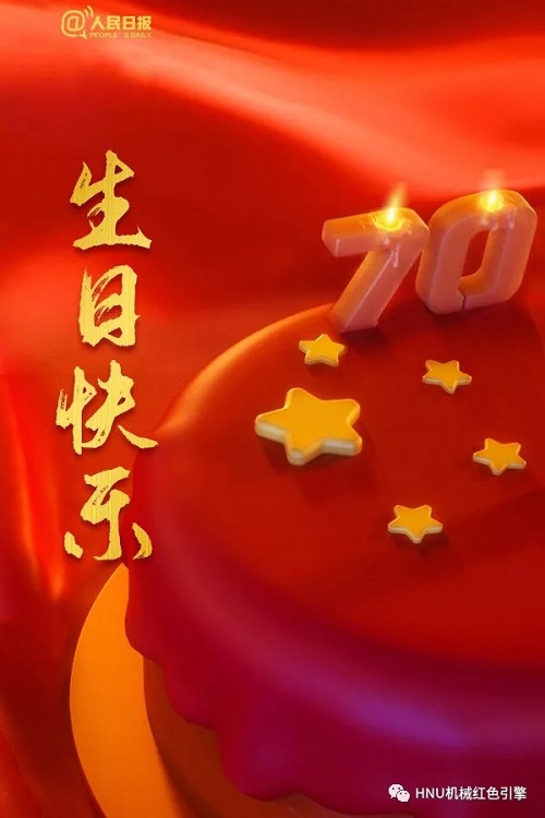 机械1708艾昌硕:七十载沧桑巨变,共和国永远年轻!湖南大学机械院2017级本科生党支部祝伟大祖国母亲:生日快乐,繁荣昌盛,国泰民安!强国一代我们在,忠于人民爱祖国。砥砺奋斗正当时,青春建功新时代!