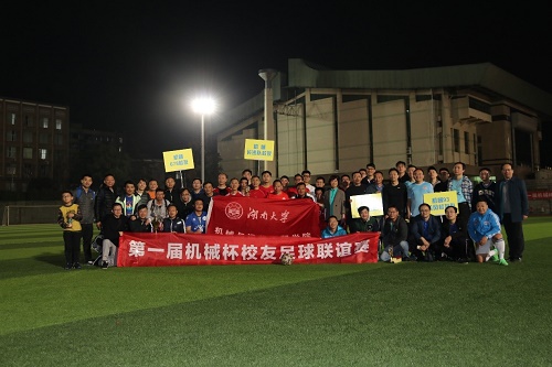 第一届机械杯校友足球联谊赛于2019年11月23日在南校区足球场开赛,“678”队、“93蓝风”队、“长沙”队、“师生联”队四支队伍参赛。