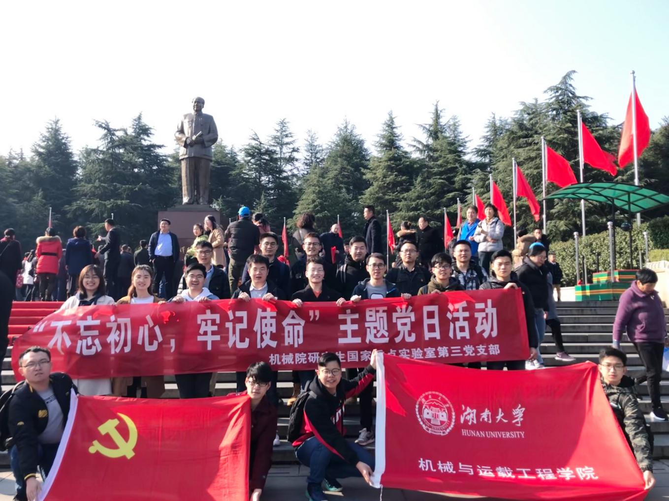 12月6日,机械与运载工程学院国家重点实验室第三党支部开展“不忘初心,牢记使命”主题党日活动,支部党员、入党积极分子来到韶山毛泽东同志故居,瞻仰伟人足迹,缅怀伟大领袖。上午9点,同志们来到铜像广场,瞻仰主席铜像。铜像广场人山人海,上到胸前挂着军功章的老红军,下到带着红领巾的少先队员,从全国各地慕名而来。导游向同志们介绍,主席铜像是按主席在开国大典上的形象设计的,铜像高6米,象征毛泽东同志为革命牺牲的6位至亲,底座高4.1米,总高10.1米,代表中华人民共和国于1949年10月1日成立。