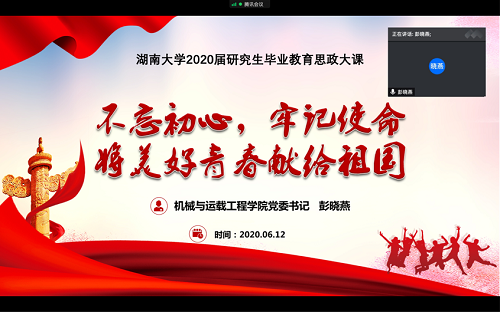 为了引导毕业生坚定“四个自信”,厚植爱国主义情怀,接好历史的接力棒,冲击时代浪潮,在实现中华民族伟大复兴中国梦的新长征路上奋勇搏击,2020年6月12日下午3点,机械院党委书记彭晓燕在线上为即将毕业的研究生毕业生上了一堂主题为“不忘初心,牢记使命,将美好青春献给祖国”思政课。