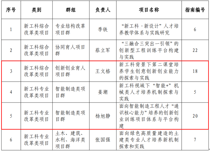 近日,教育部发布《教育部办公厅关于公布第二批新工科研究与实践项目的通知》(教高厅函〔2020〕23号),我校推荐申报的6项新工科研究与实践项目全部获批立项,获批数量居于湖南省第一。其中我院申报的3个项目(下图第3至5项)均获批立项。