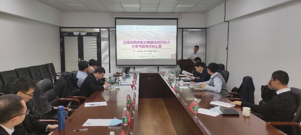 随后,由秦晓辉副研究员就“三维高精度地图及其路径规划技术开发与应用项目”做汇报。秦晓辉表示,项目需求主要包括高精度地图的构建与更新、地图感知、室内定位等一系列关键点。针对项目的方案架构,秦晓辉从系统架构、硬件架构以及软件架构三个方面做了系统的阐述,并对高精地图、地图感知、决策规划和激光定位等关键技术也做了具体的介绍。