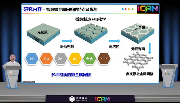 该获奖课题创新性地提出“多功能金属微网格柔性电极”的新思路,通过将微纳光刻和高精度电镀技术相结合制备了系列材质、形状、尺寸、透光率和厚度可精准控制的柔性超薄超轻金属网格,并将其成功应用在柔性电池和柔性电致变色器件中(相关工作请见https://onlinelibrary.wiley.com/doi/10.1002/adfm.202106550;https://onlinelibrary.wiley.com/doi/full/10.1002/adfm.202100290;https://onlinelibrary.wiley.com/doi/10.1002/eem2.12303),为柔性电极的轻量化设计和柔性电子的多功能集成提供了一种新的方法和思路。