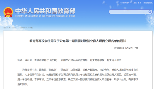 为落实党中央、国务院“稳就业”“保就业”决策部署,深化产教融合、校企合作,推动人才培养与就业有机联动、人才供需有效对接,教育部高校学生司鼓励各高校与用人单位合作,申报供需对接就业育人项目。