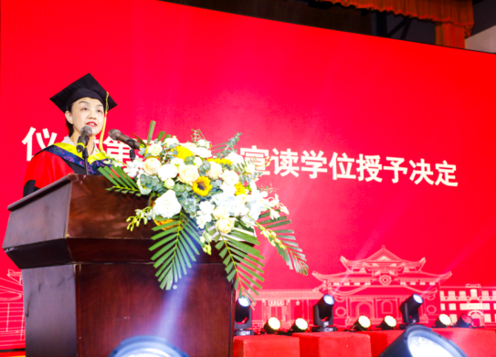 彭晓燕书记宣读了《湖南大学学位评定委员会关于2021-2022学年度博士、硕士、学士学位授予的决议》。共404名本科生,404名硕士研究生,24名博士研究生被授予学位。