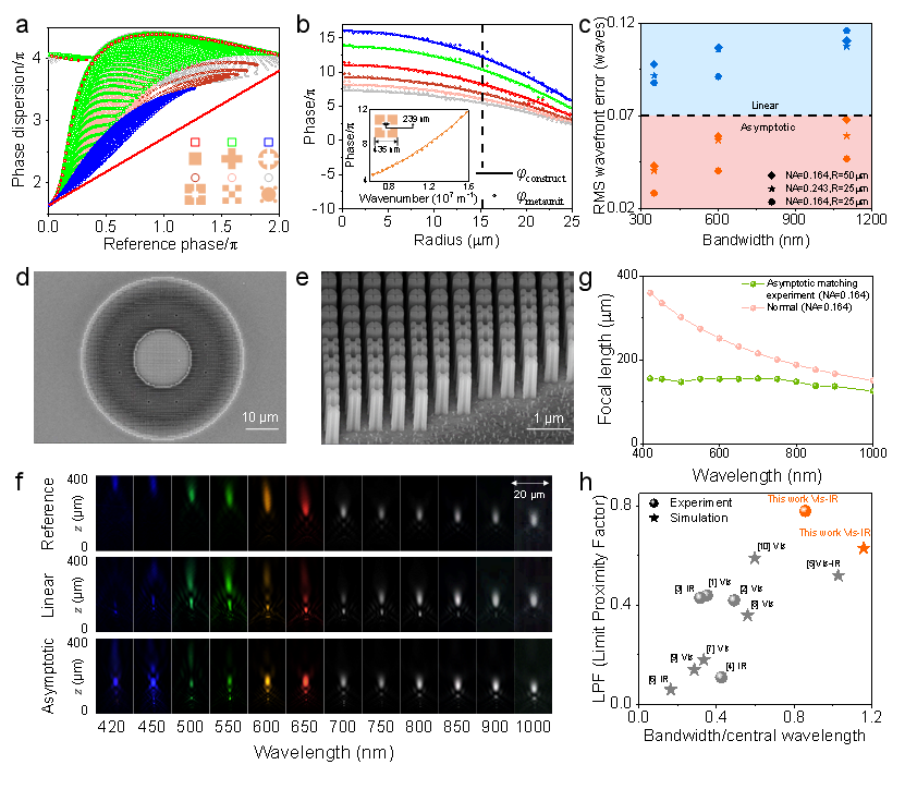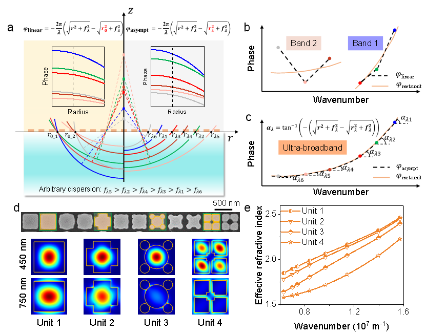 利用该方案,研究团队展示了高深宽比纳米结构组成的超宽带消色差电介质超构透镜,其波段从400纳米到1000纳米,横跨可见光到近红外波段。此外,该方案还提供了极大的自由度,可实现各种类型的定制色散调制(正色散、负色散、任意色散)。所提出的方法完善了单层色散控制超构透镜设计的理论框架,不仅可以实现无带宽限制的任意色散操纵,还为打破最大相位色散限制提供了潜在的解决方案,有望在超宽带成像和光谱检测等领域得到重要应用。