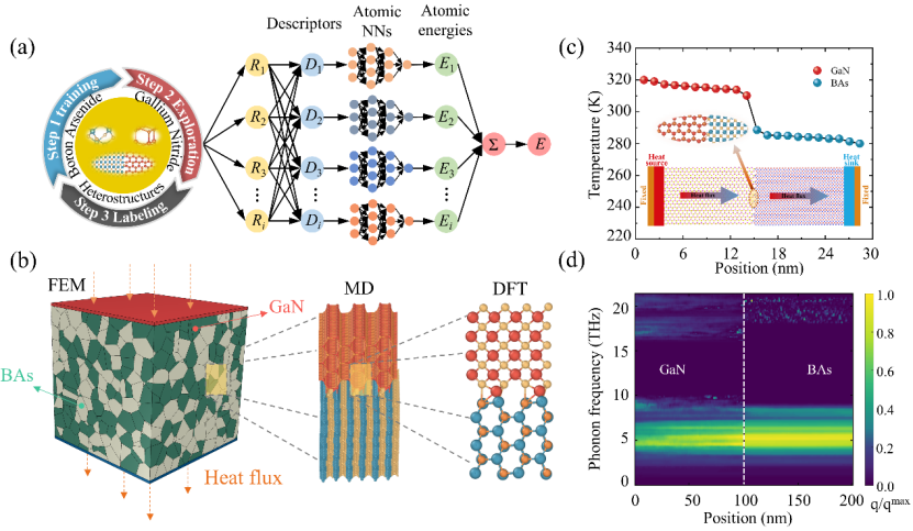 采用先进的机器学习技术,秦光照教授团队揭示了氮化镓和砷化硼异质结构之间存在的超高界面热导(260 MW m-2K-1),这主要得益于两种材料之间声子能带结构和晶格振动的高度匹配。这一发现打破了传统散热性能的局限,为电子设备、芯片和集成电路的高效散热提供了可能。相比于其他氮化镓异质结构,如氮化镓-金刚石和氮化镓-碳化硅,氮化镓-砷化硼异质结构的界面热导在300到450 K的温度范围内显示出了明显的温度依赖性。这一发现对于促进砷化硼在电子器件冷却领域的实际应用具有重要的意义。