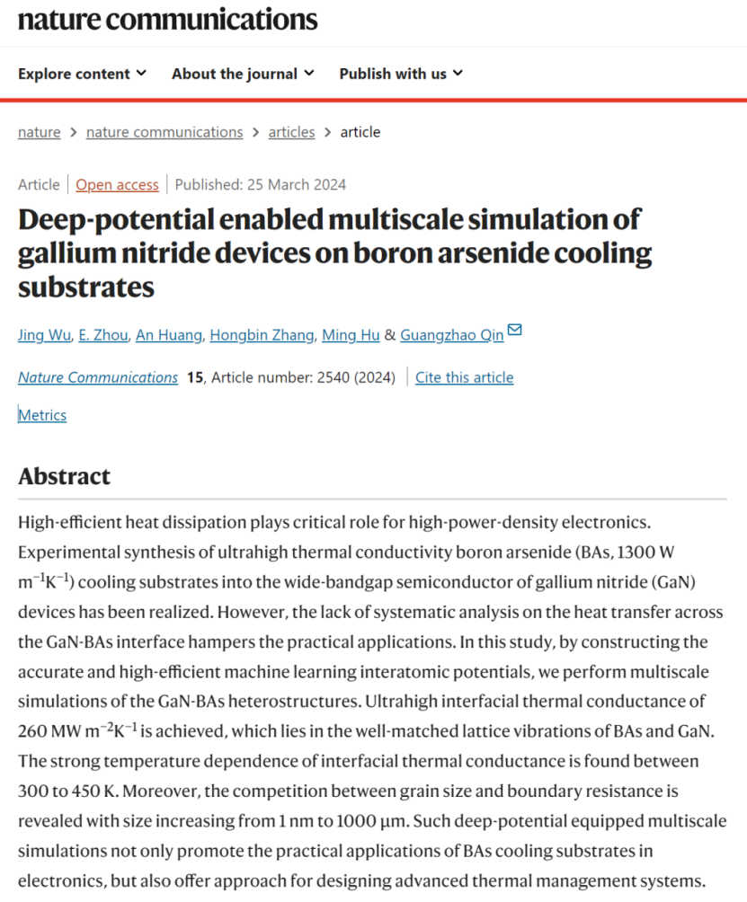 Jing Wu, E Zhou, An Huang, Hongbin Zhang, Ming Hu, Guangzhao Qin*, Deep-potential enabled multiscale simulation of gallium nitride devices on boron arsenide cooling substrates,Nature Communications 15, 2540(2024) ;