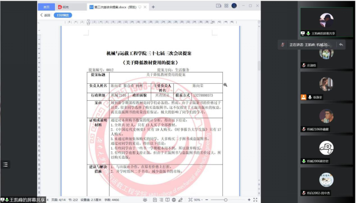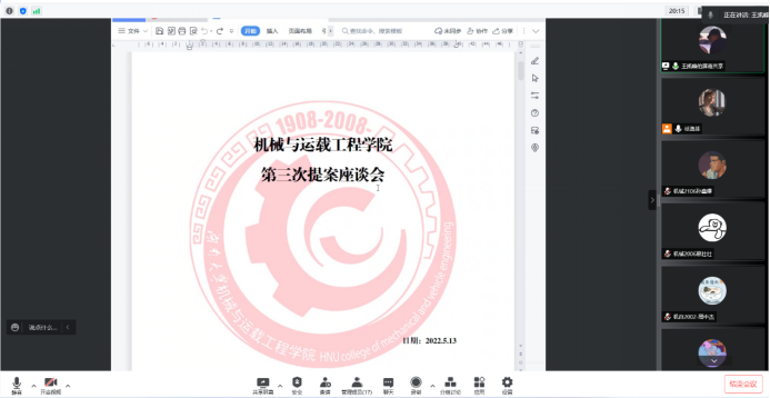 5月13日晚,我院召开了机械与运载工程学院第三次座谈会,本次会议积极响应防疫要求,采用线上会议的形式。会议对学生代表所提交的提案进行了讨论与交流,总结出各种提案的解决方案。