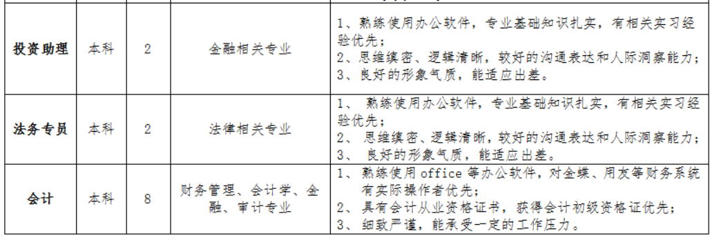 招聘专业:金融学类,金融工程,投资学