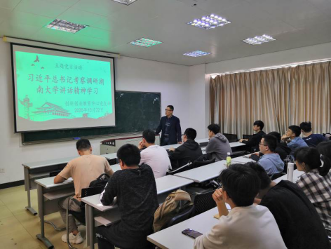 下午1点,主题党日活动正式开始。张海成老师就此次习总书记考察调研湖南大学重要讲话精神给同学们进行分析讲解。首先,提倡继续弘扬优秀传统文化。希望同学们坚持实事求是的思想和经世致用的传统,强调从实际出发来研究学习和解决问题。接着,讲述加强和创新思政课的重要性。课程教学与实践教学相结合,讲述坚持“六要”标准对打造师资队伍的要求,让同学们了解思政课教学对讲学育人的重要性。最后,鼓励大家勇担时代重任,争做时代新人。惟楚有才,于斯为盛。鼓励同学们感知新的思想观念,学习新的知识本领,养成新的精神风貌,勇做时代新人,为祖国的未来做出更大的贡献。