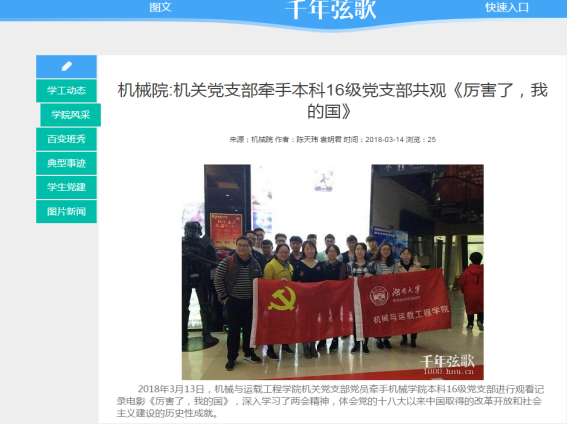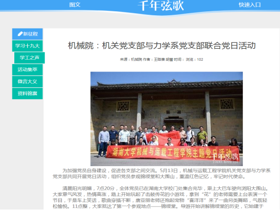 支部重视用党的理论知识武装干部,支部书记带头组织学习《党章》、《廉洁自律准则》、《纪律处分条例》等党内最新文件,加强思想建设、组织建设, 深入开展了“两学一做”等专题教育活动,营造了浓厚的学习氛围,提升了党员干部的思想觉悟。支部党员在经常受到理想信念教育、党性教育、党的优良传统作风教育、怎样做一个合格党员的教育,增强党员的党性观念,加强党性修养,从而在各项工作中自觉地发挥先锋模范作用。注重知行结合,打造全方位学习平台。联合国防生、力学系教工等支部开展“微党课”“赴湖南省苏维埃旧址学习”“庆祝建党96周年知识竞赛”等“两学一做”主题学习教育活动,拓展及规范活动阵地建设,加强了学习教育,拓展了机关支部的中枢作用和服务功能;注重文化育人职能,赴湖南省博物馆开展“传承湖湘文化,争做时代先锋”主题实践活动;结合实时热点开展学习,在十九大、两会等期间,机关党支部同志学习心得多次在湖南大学新闻网、湖南大学官方微信等校级平台被采用。